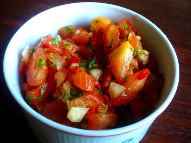 Pomidory sparzamy wrzątkiem i obieramy ze skóry. Papryczkę kroimy drobniutko, podobnie cebulę i natkę. Siekamy pomidory w niedużą kostkę, mieszamy z resztą składników i solą.